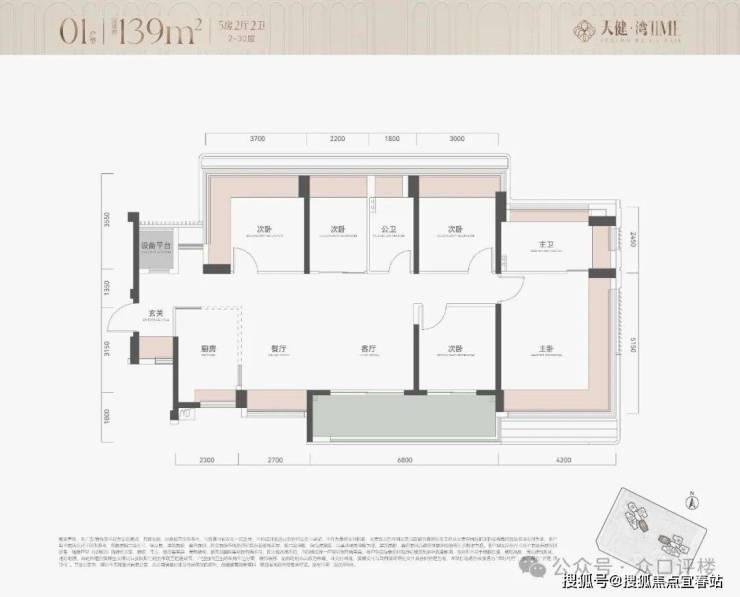 户型产品为113㎡ 4房和139㎡ 5房 约290套,2栋100米内31层住宅,2梯4户,其中主力为113㎡ 4房,具体户新图暂未公布。