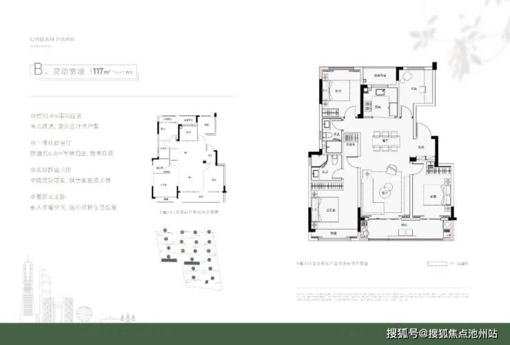 而(建面约)118方户型为经典四叶草格局,南向三开间,面宽达到了约10.4米,客厅与次卧贯通的长阳台近6.8米长,观景休闲、惬意无边。