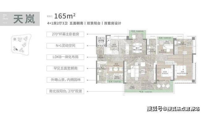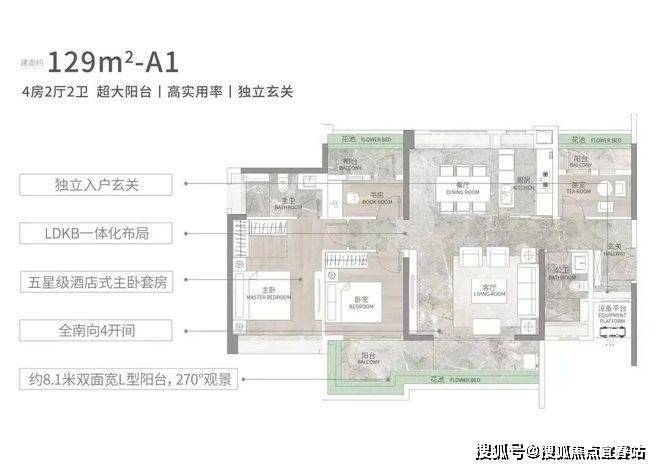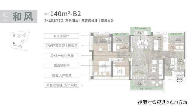 140平、160平都预留了+1的灵活空间,可根据家庭需求,改造成5房。而且都有独立的L型入户玄关,南北双阳台,主卧主卫270°观景飘窗。