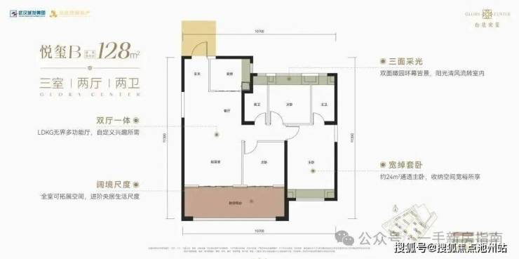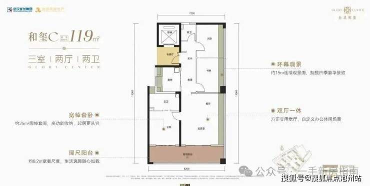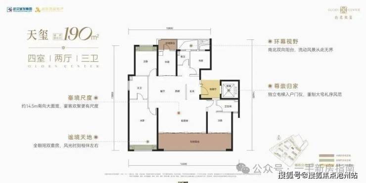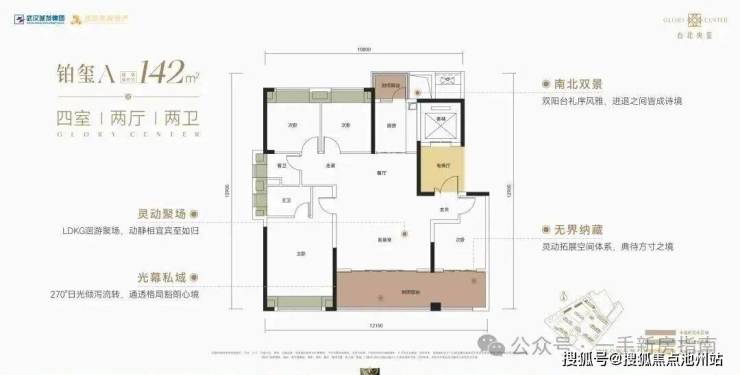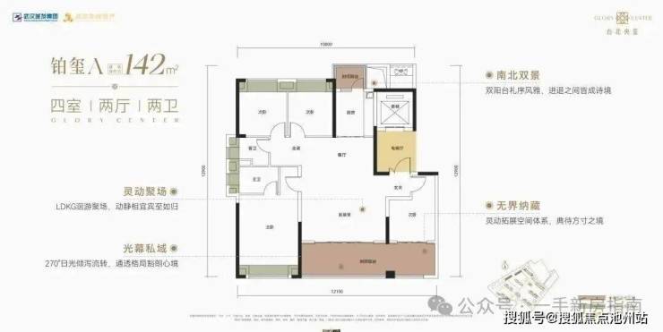 该户型为1号楼1单元单元连接处边户,南北通透,三开间朝南。该户型有独立电梯前室,南北双阳台,4个飘窗,入户体验和居住舒适度相对中间户更好。