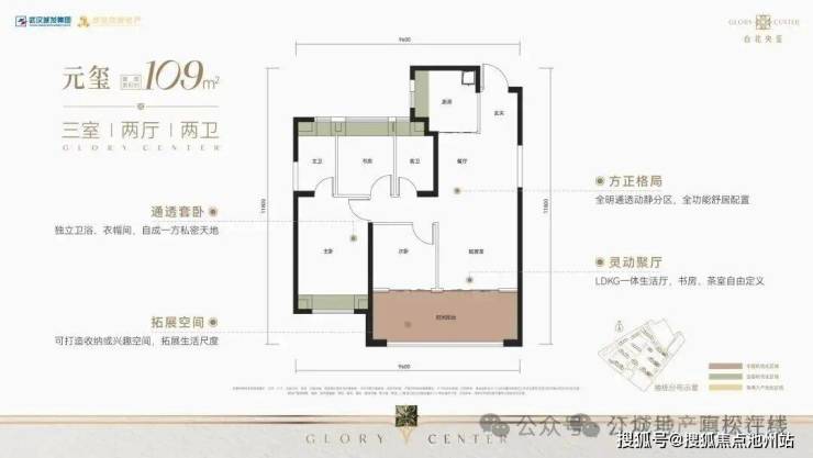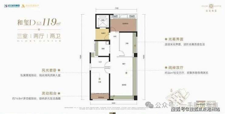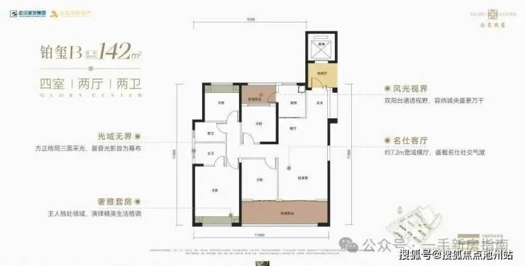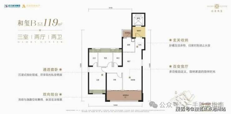该户型为9号楼单元连接处边户,南北通透,三开间朝南。该户型带独立电梯前室,南北双阳台,共2个飘窗,而且是“类三叶草”结构。