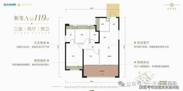 该户型为9号楼端头边户,南北通透,三开间朝南。