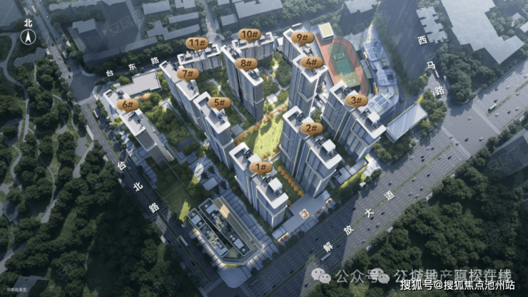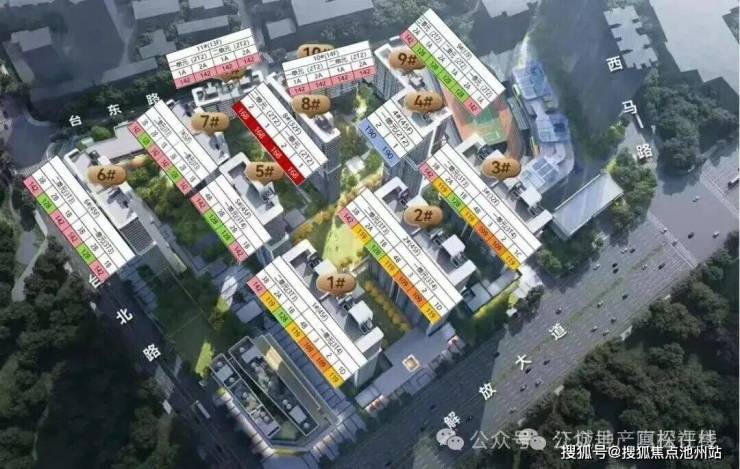 从平面图来看,该项目四面临道路,1、4、9号楼均为西南朝向,与台北路平行。