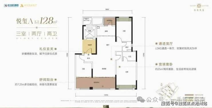 该户型为1号楼2单元单元连接处边户,南北通透,三开间朝南,南向大阳台+5个飘窗,有电梯前室优化区域,比传统三代住宅,得房率略高。