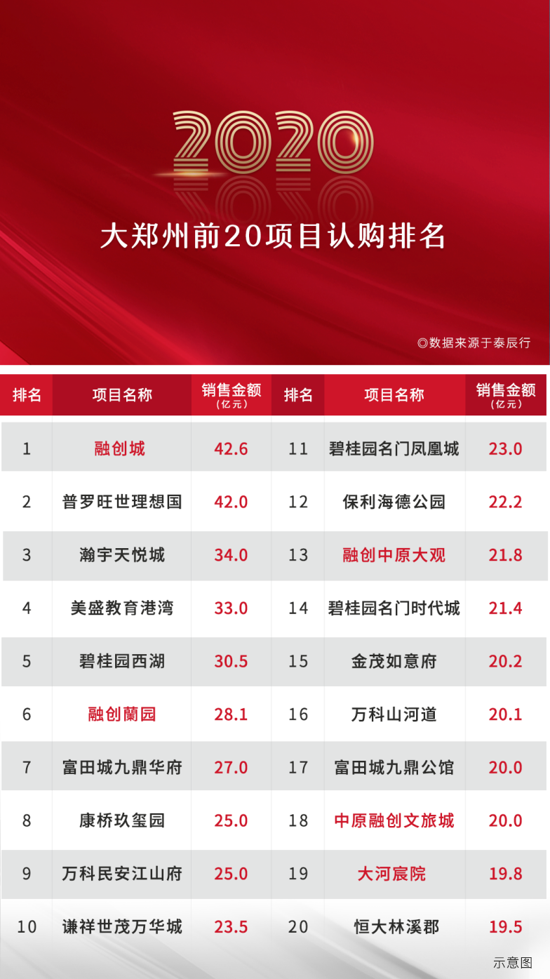 当时间晃过2020,2021的脚步逐步迈开,融创郑州以185亿元销售(认购)金额,成为“2020年大郑州房企商品房销售金额TOP 1”。其中,融创城以42.6亿元的认购金额成为“2020年大郑州单项目销售金额TOP 1”;融创蘭园以28.1亿元的认购金额排名大郑州单项目销售金额第6,融创中原大观、中原融创文旅城、融创大河宸院分别以21.8亿元、20亿元、19.8亿元的认购金额入围年度销售金额TOP20。(数据来源于泰辰行)