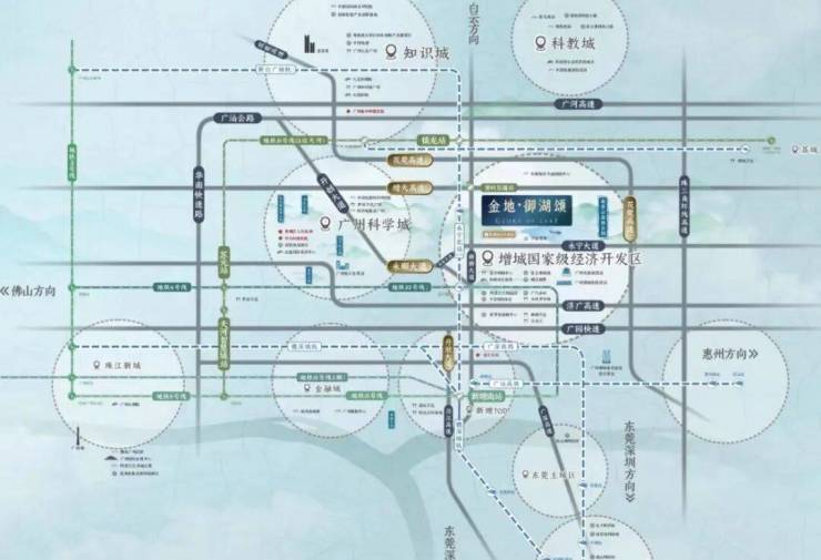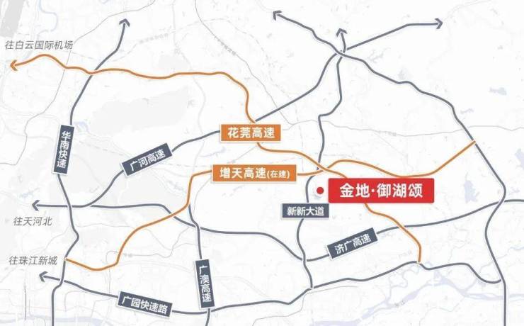 6条高快速路链接湾区:济广高速、增天高速(预计2025年开通)、花莞高速、广园快速、广惠高速、广深高速等,穗莞深城际串联珠三角城市群,新白广永宁北站(在建)即将通车。