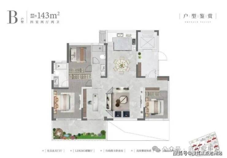 建面约143㎡,四房两厅两卫,得房率约106.75%,带约19.26㎡全赠送的空中花园,以及独立电梯前室。