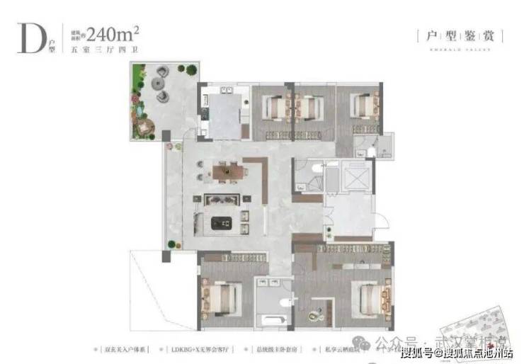 建面约240㎡,五室三厅四卫,位于13层的小高层,得房率更高达111.87%。