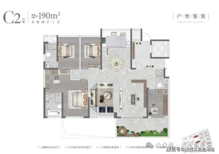 另一个建面约190㎡,做了五房的设计,功能性较强,得房率约105.39%。