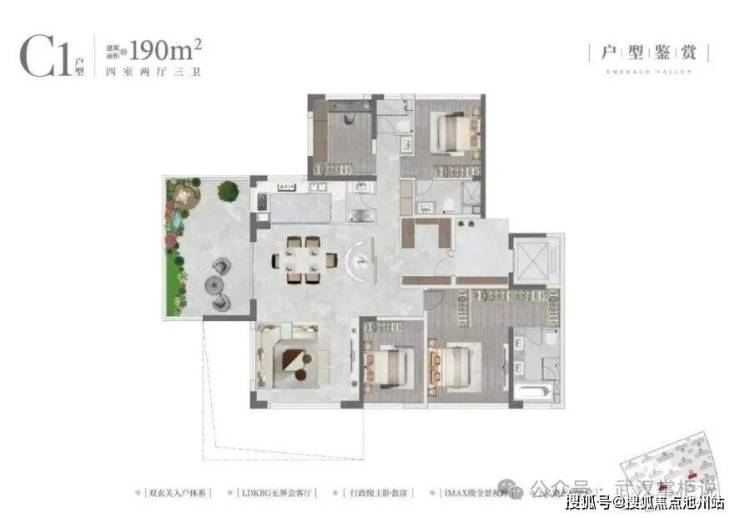 建面约190㎡,四房两厅三卫,得房率约107.45%。
