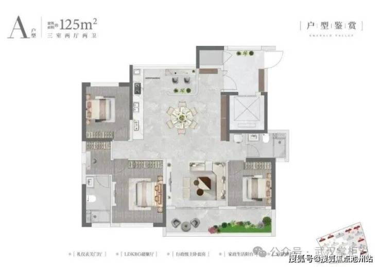 建面约125㎡,三室两厅两卫,得房率约94.6%,约6.9米双联景观台,还有近7㎡独立电梯前室。