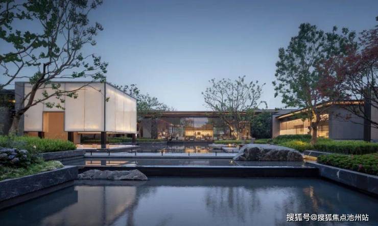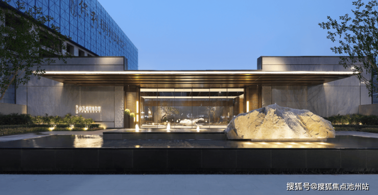 建筑整体方正硬朗、沉稳大气,两侧搭以朴树和精致花境,营造充满东方美学的礼序入口。视觉中心处,山石横卧于水景之上,与泮池砚台相映成趣。长砚迎宾,赋予归家礼仪的尊崇感