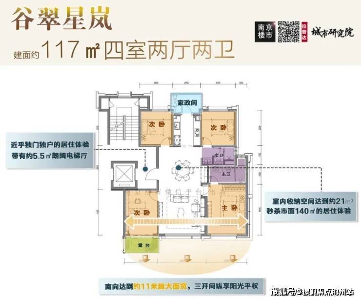 极致产品:105㎡是南京带家政间的最小户型,创新打造270°L型转角露台+主卧双面窗,最高接近100%实用率