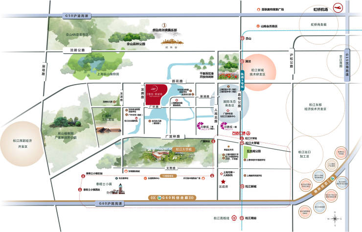 生态环境优美:谈及生态,项目更是占尽先机。西侧八百米处便是国家4A级旅游景区——广富林文化遗址与广富林郊野公园,历史底蕴与自然风光交相辉映;北侧两公里处,辰山植物园、佘山旅游度假区及欢乐谷等休闲胜地依次排开,为居民提供了丰富的休闲娱乐选择。在此居住,既能享受到都市生活的便捷与繁华,又能拥抱大自然的宁静与美好,真正实现了居住与自然的和谐共生。