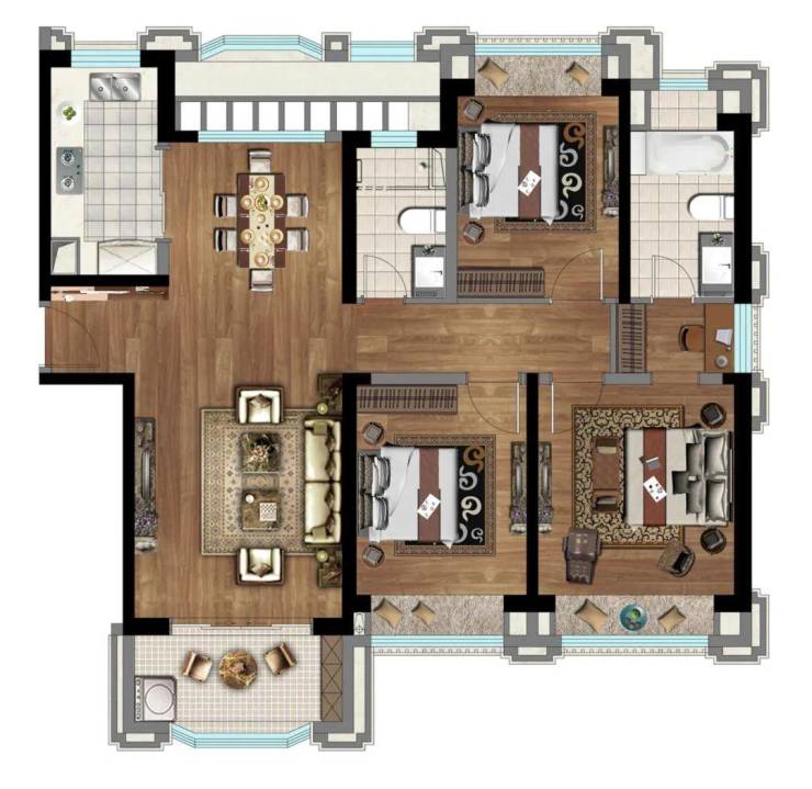 建面约95㎡2房,创新户型,全明设计。在一体化设计的客餐厨阳台中,一家人平时聚在其中,无论是坐在沙发上歇息、在厨房中烹饪、在饭桌上吃饭,窗外的风景都是生活的点缀。