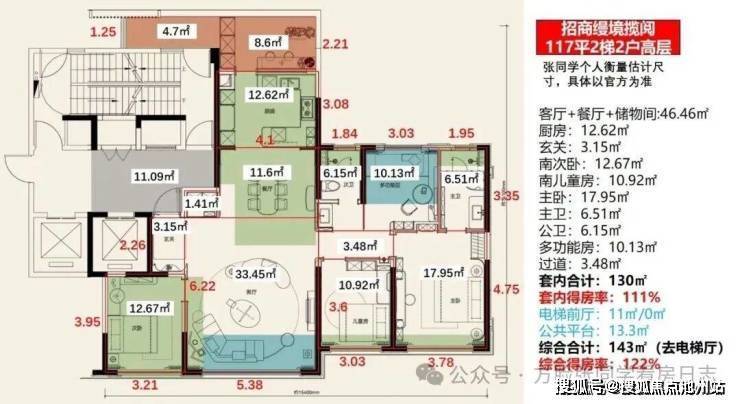 建面约117㎡四房两厅两卫:实得约137㎡,阔境四房,契合小太阳家庭