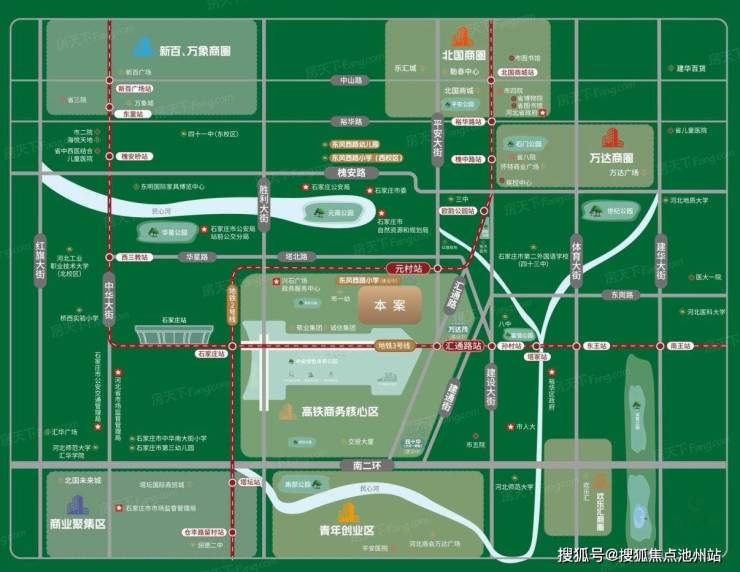 周边直线3km范围内有13个地铁站(元村、汇通路、欧韵公园、孙村、石家庄站、槐中路、塔坛、塔冢、西三教、裕华路、槐安桥、仓丰路留村、东王),轨道交通发达,距离最近的地铁站是元村。