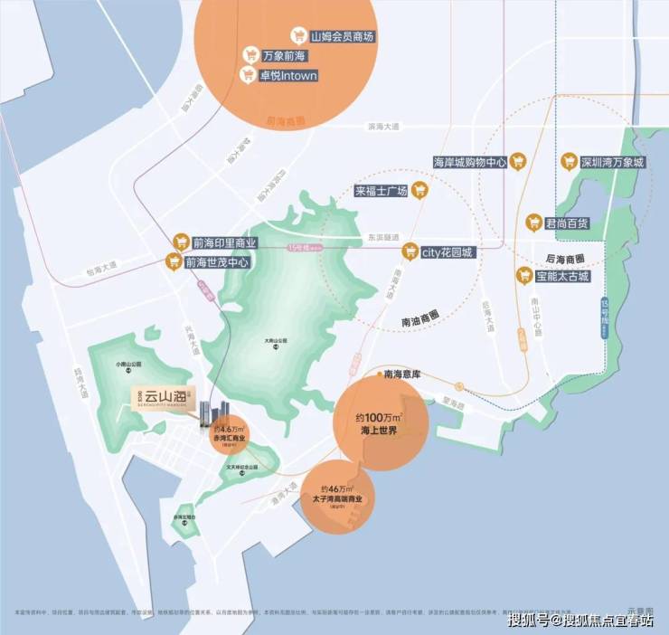 🔘干道环伺:约1.5公里范围内有兴海大道、南海大道、望海路、港湾大道、月亮湾大道等干道,直抵前海、宝中、福田