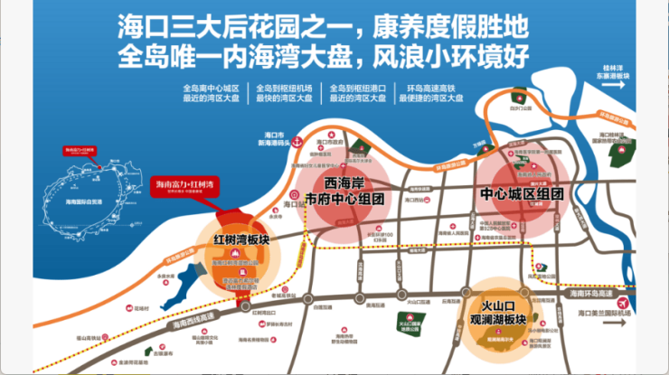 1、环岛高铁、环岛高速、环岛旅游公路,三线合“璧”,贯穿红树湾,海口西门户首站,全海南最便捷!
