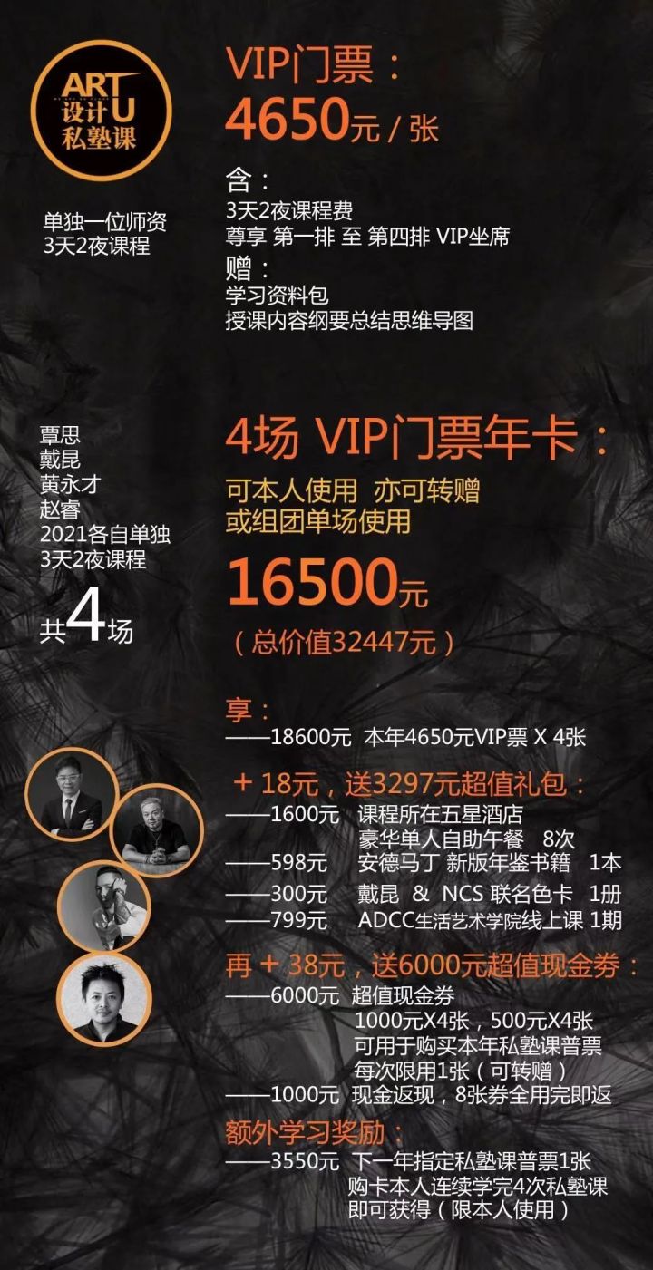 以上票价不含差旅食宿,门票一经售出,不退不换年卡+18+38 超值礼包现金劵只限前100名可享 ART U老学员专属超值优惠请扫码咨询 录取要求: 1.扫助理老师微信二维码咨询,索要缴费账号,支付门票费用;2.收到费用20天内将发放录取通知书;