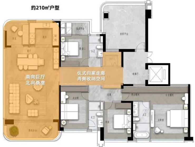 210㎡户型:打造顶配仪式感的尊贵户型,长约7米宽约2米的归家走廊+全景端厅,把江景框进家里。