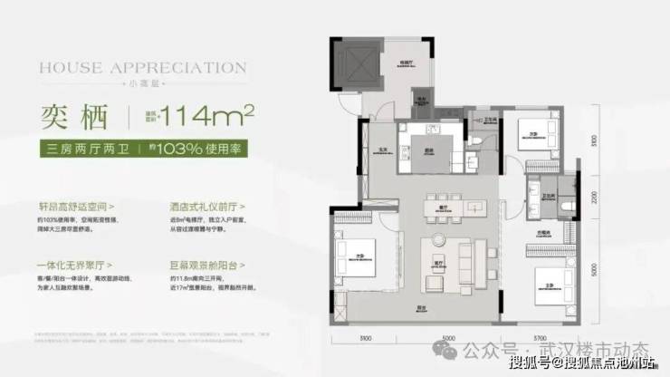 建面约114平三房两厅两卫,优化后约103%的使用率: