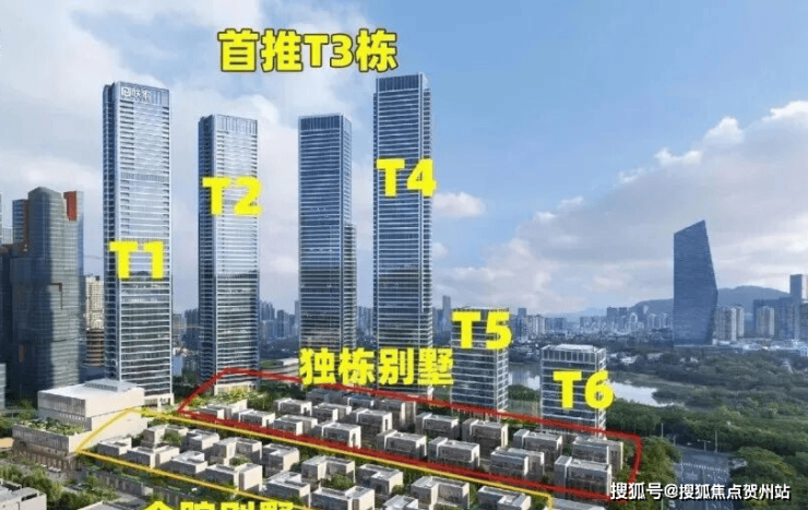 规模:占地约 9.2 万㎡,计容建面约 27.7 万㎡,容积率仅 3.0(片区最低密);含 4 栋超高层公寓(51-63 层,T1 为 388 米地标)、35 套商墅(19 栋独栋 + 16 栋合院)、2 栋写字楼、1.4 万㎡高端商业;公寓仅约 300 户,车位比 1:2.3(2766 个)。