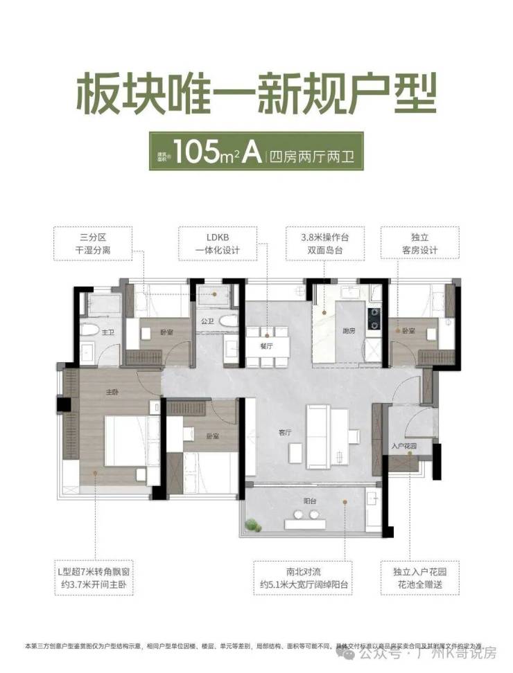 约105㎡户型,四房两厅两卫,南北对流户型,独立入户花园,客厅有约5米大宽厅,LDKB一体化设计,主卧带L型超7米转角飘窗。