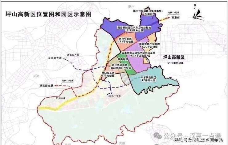 交通方面有坪山高铁站,地铁方面有14号线、16号线、比亚迪云巴。还有在建的19号线、深大城际、深惠城际大鹏支线以及深汕高铁。