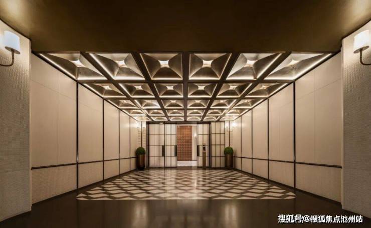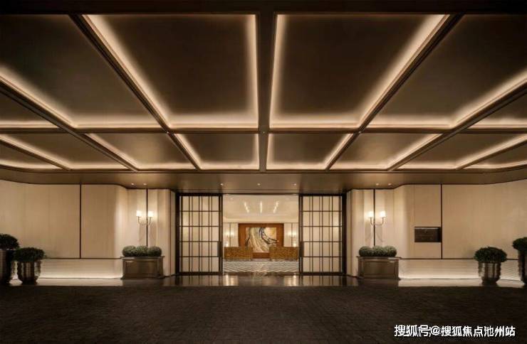 步入门庭,云石吊顶之下,借鉴中国古代建筑中的“藻井”做法,由522片皇家白玉石材拼接而成,凝聚光华,辉映时空。华光之下,中心水池承托起艺术雕塑,莹润皎洁,宛若珍宝。立面则采用铂金钻奢石,搭配墨绿荷塘月色奢石、安哥拉黑奢石花钵、以及手工锻造的巨幅铜门,流淌出一抹温润质感。