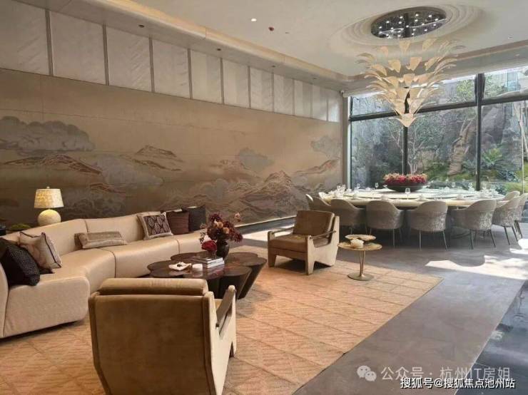整个私宴厅有约130㎡,可同时容纳20人的大圆桌,带岛台、喝茶区、麻将室,连顶上灯都寓意步步高升,应景。