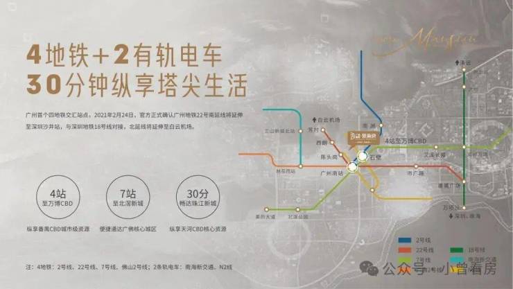 4地铁:2号线、22号线、7号线、佛山2号线。4站至万博CBD、7站至北滘新城、30分钟至珠江新城。