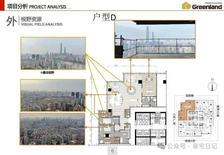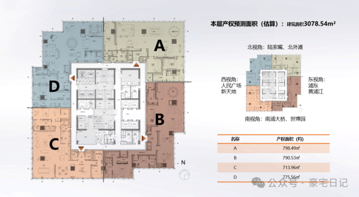 本案北视角:陆家嘴、北外滩;西视角:人民广场、新天地;东视角:浦东、黄浦江;南视角:南浦大桥、世博园。