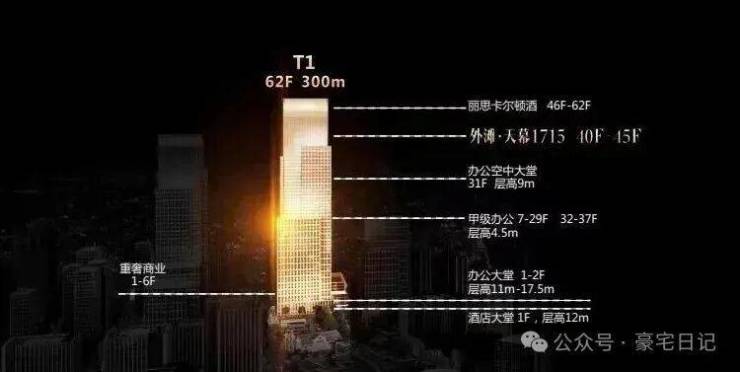 绿地外滩中心项目占地面积约12.67万㎡,总建筑面积约119.9万㎡,地上建筑面积中,计容建筑面积约70.19万㎡,其中商办57.5558万㎡,住宅12.6342万㎡。项目包括4栋甲级写字楼(T1,T3分别为300米+240米)、7栋总部办公楼、购物中心、超高层星级奢华酒店、8栋住宅楼等。其中300米的超高层规划蓝图,在天际建筑汇聚的外滩,再一次刷新了城市天际线,T1-300米超高层上部,46-62层为五星级酒店(丽思卡尔顿)38-40-45层为行政公馆!中部7-37层为甲级办公,底部为商业及大堂。