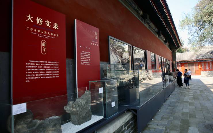 院内还展出了一些修缮替换下来的建筑构件、考古发掘的石材。“这是万佛阁的一根大梁,也是此次万寿寺大修的契机。由于屋顶漏水,这块木头腐烂,导致梁塌了。我们采取传统的‘抽梁换柱’方法,换上了新的。”王丹说,从展览中观众也可以了解到古建一麻五灰、贴金等传统工艺。