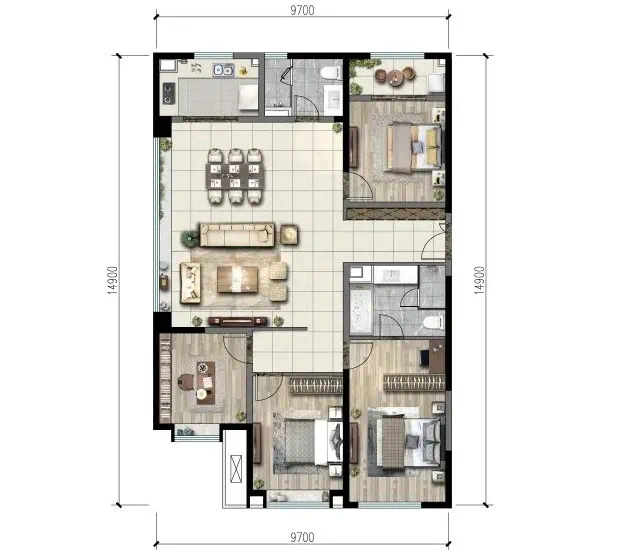建面约165㎡四室两厅两卫:通透方正,三面朝南;主卧套房,北向次卧外联观景阳台,宽绰舒适;餐客厅超大落地窗面,城市美景尽收眼底。