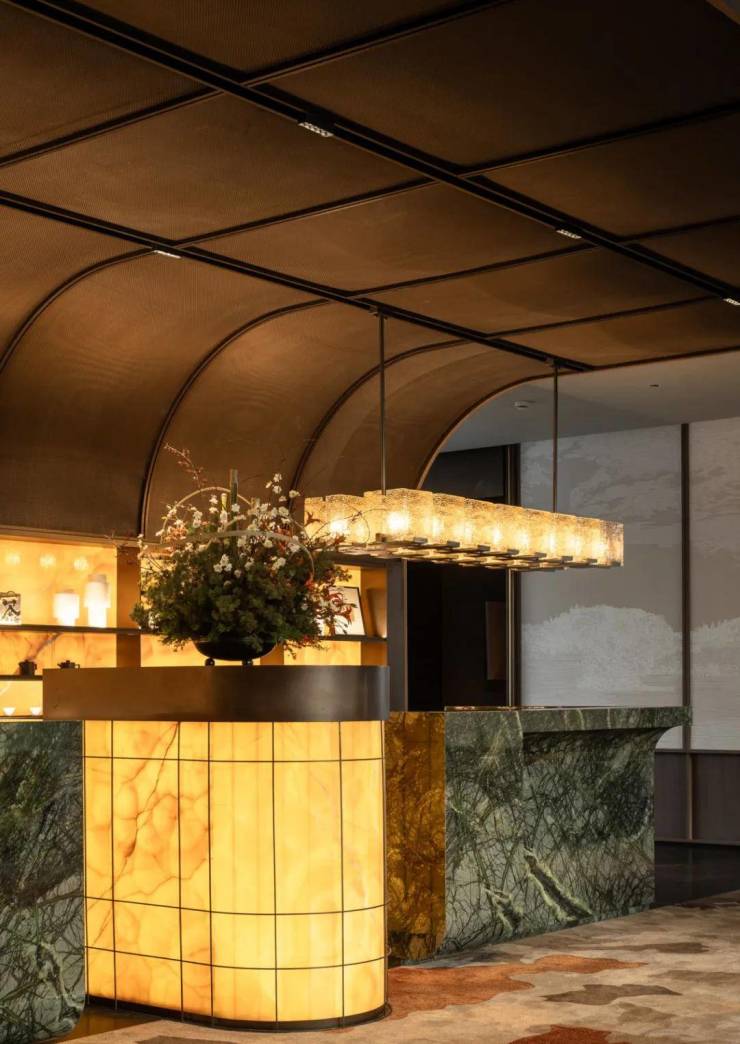 “山欲高,尽出之则不高;烟霞锁其腰则高矣。水欲远,尽出之则不远;掩映断其脉则远矣。”国人讲究含蓄、朦胧之美,丹枫水院将山水美景置于框中,是为框景;琉璃水院,浮光廊两侧,是为对景;将冬青、乌桕,橄榄绿、菲油果、铁冬青等近百种植物以及山石、瀑布叠水引入园中,是为借景;透过套方锦纹花格屏风窥见园中景色,是为漏景;黑山石、蟒水纹金属贴片朦胧之下,让人觉得意犹未尽,是为障景。海上瑧悦运用多种组景手法,一山一水,一花一木,步移景异,无不体现层次之美,动态之美。