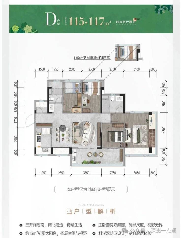 115-117㎡的4房2厅2卫,设计的是横厅南北通透格局,进门入户玄关,客餐厅6米开间,LDKB一体化设计,主卧套房双飘窗,分别做到了主卧20.83㎡/次卧8.74㎡/次卧8.93㎡/次卧8.25㎡(包含墙体飘窗),客厅连接次卧出12.8㎡的巨幕大阳台,U型厨房,科学双明卫,得房率约78.9%(不含赠送),阳台主朝东南向。套内面积92.08㎡+赠送面积21.55㎡=实得113.63㎡,加上赠送后得房率约98.44%。