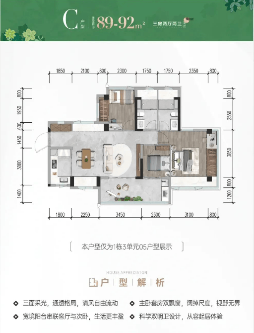 89-92㎡的3房2厅2卫,C户型,设计的是横厅南北通透格局,进门入户玄关,客餐厅5.7米开间,LDKB一体化设计,主卧套房双飘窗,分别做到了主卧18.5㎡/次卧7.7㎡/次卧6.9㎡(包含墙体飘窗),客厅连接次卧出11.5㎡的巨幕大阳台,U型厨房,科学双明卫,得房率约78.9%(不含赠送),阳台主朝东南向。套内面积71.4㎡+赠送面积22.8㎡=实得94.2㎡,加上赠送后得房率约105.22%。