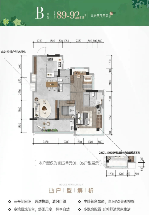 89-92㎡的3房2厅2卫,B户型,设计的是竖厅格局,客厅3.45米开间,LDKB一体化,S墙设计预留冰箱卡槽位,三开间朝南,动静分区,主卧270无边转角飘窗,分别做到了主卧18.1㎡/次卧9.44㎡/次卧5.98㎡(包含墙体飘窗),客厅连接次卧出10.35㎡的大阳台,U型厨房,公卫三段式分离,得房率约78.9%(不含赠送),西南或东南朝向。套内面积70.73㎡+赠送面积17.9㎡=实得88.63㎡,加上赠送后得房率约98.89%。