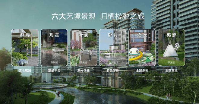 项目规划上千万的资金投入,只为给业主打造一个约2.6万㎡的内湖公园,湖内设有专业的水体净化系统、养殖水生植物,保障湖水常年清澈,达到观赏性水质标准;同时,沿湖打造6大艺境景观,构筑社区灵魂。