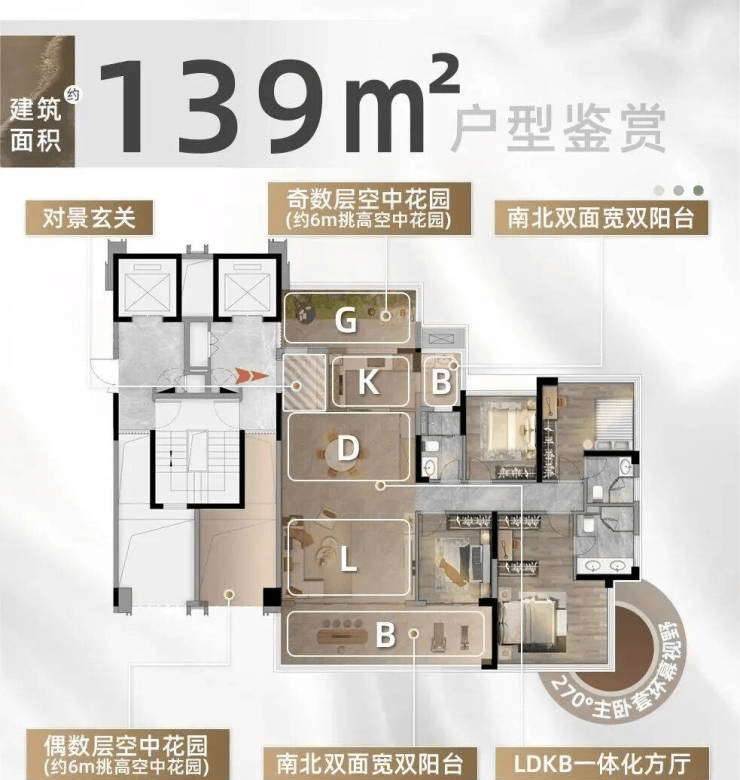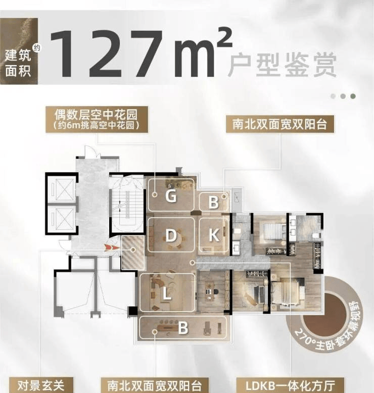 大平层“云璟组团”,涵盖127-170㎡四房,核心亮点是“6米挑高空中花园+超高得房率”,且奇偶层户型略有差异。