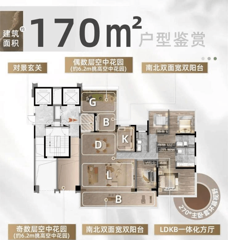 170㎡四房:双层6.2米通高空中花园,南侧10.6米巨幕阳台,北侧7.6米家政阳台,52㎡大方厅+双套房,实际使用面积204㎡,堪比别墅尺度。