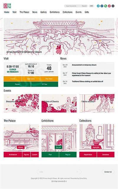 在视觉设计上,恭王府博物馆新版英文网站将恭王府博物馆原创的传统绘画线描风形式与王府特色景致进行融合,以清代王府传统色彩中的红、绿两色作为主色调,辅之以黄色、灰色,色调清新典雅且别具一格,中国传统建筑的风姿尽显无遗。基于馆藏丰富的历史文化资源,网站分为导览、动态、光影、展览、藏品、活动和文创等栏目,充分展示恭王府博物馆的底蕴与风采,让海内外用户通过“云端”了解恭博、爱上恭博。