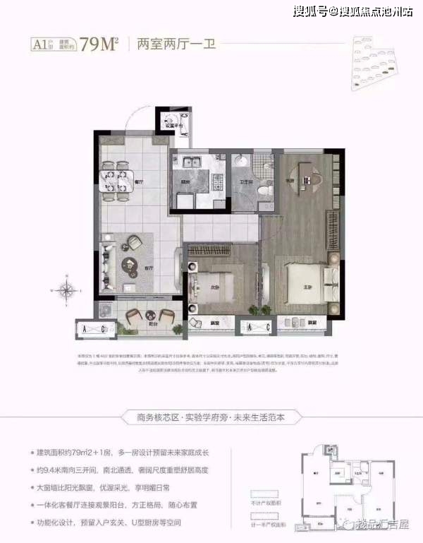 本案是由金地集团和先进集团联合打造的高端定位住宅以上为79㎡灵动户型 得房率比较高 使用面积广,户型方正,采光优质