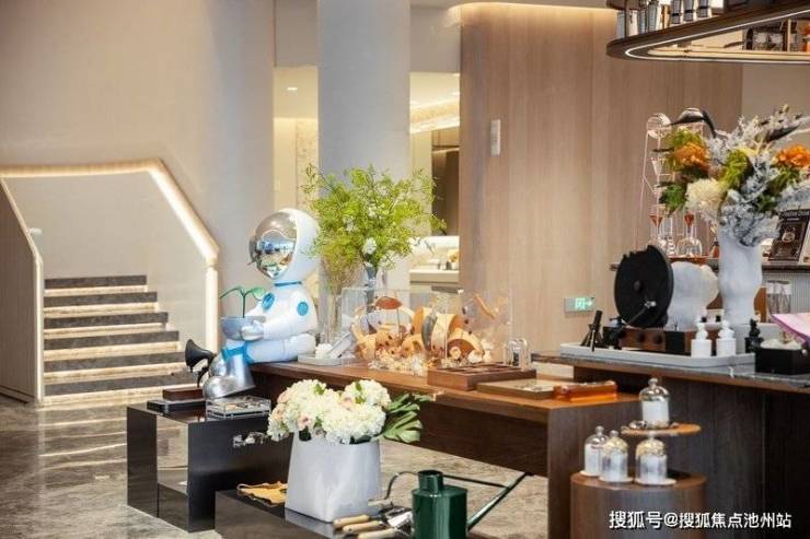 特别想聊聊两个印象深刻的区域:“斐波那契图书馆”,它将数学之美完美融入生活。园林的中心是斐波那契螺旋线构图的艺术肌理石材,展现出一种“中古美学”的风格。外侧则由风雨连廊围合,形成多功能空间,既有图书馆、幸福小课堂,也有休闲吧台,巧妙地将生活感、园林感与艺术感融合在一起,堪称社区的灵魂邻里中心。