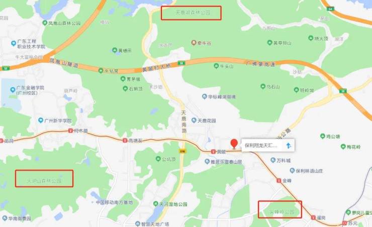 项目周边稀缺生态资源环绕,譬如约600公顷的火炉山森林公园、约880公顷的广州东肺帽峰山/天鹿湖森林公园,还有梅花岭/尖峰岭公园,广州科学城体育公园……