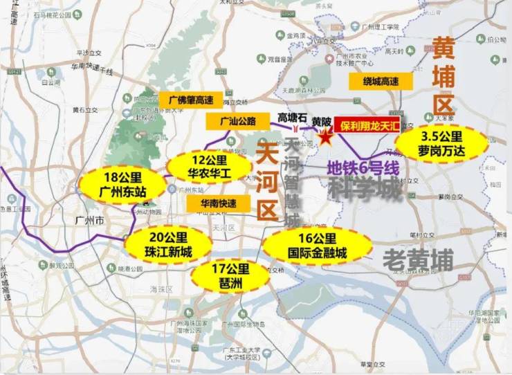 保利翔龙天汇,距离横贯荔湾、越秀、白云、天河和黄埔五区的6号线,黄陂地铁站B口直线约400米(来源:高德地图测距)。