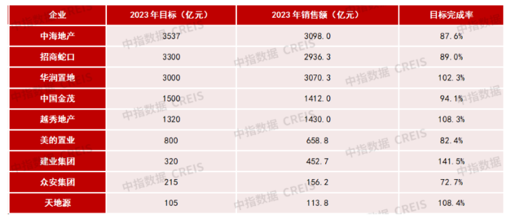 从销售目标完成率来看,2023年,9家房企目标完成率均值为98.5%。其中,华润、越秀地产、建业集团、天地源完成全年目标。