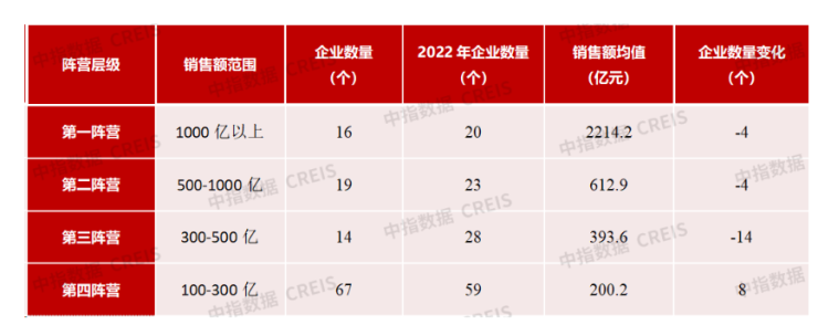 从各大阵营房企销售额来看,2023年,百亿以上阵营企业数量减少。其中,销售额超千亿房企16家,较去年同期减少4家,百亿房企116家,较去年同期减少14家。